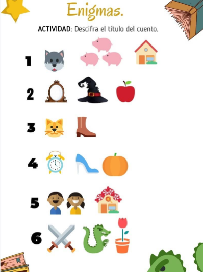 - Enigmas: adivinamos el título de cada cuento con los dibujos de la foto de aquí abajo.